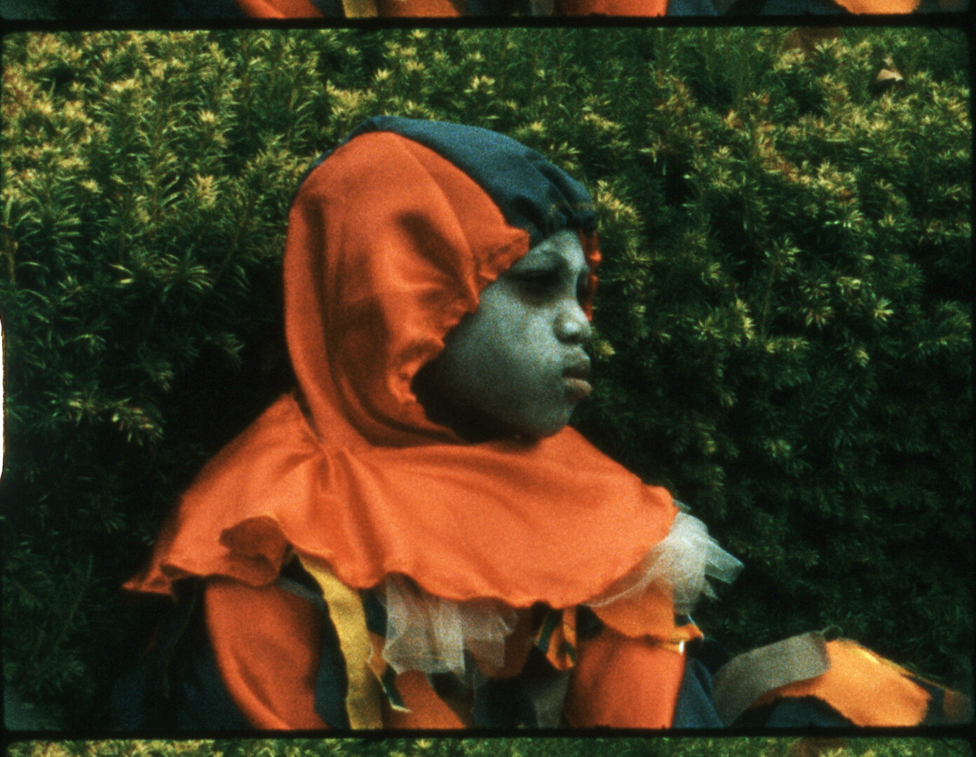 Something More Than Masquerade sees a young Pierrot Grenade contemplate the spirit of carnival. Pierrot Grenade is a well known character and storytelling device within Caribbean folklore and masquerade traditions, often associated with Trinidad and Grenada and encountered across the Caribbean. This is intended as the first in a series of moving image works exploring Caribbean folklore and masquerade traditions, the retention of African masquerade practices in the Caribbean, and their relationship to resistance and rebellion on the plantations. Here we meet a young boy dressed as Pierrot Grenade as he reflects on how with contemporary carnival celebrations—such as Notting Hill Carnival which features—many fail to realise these origins.